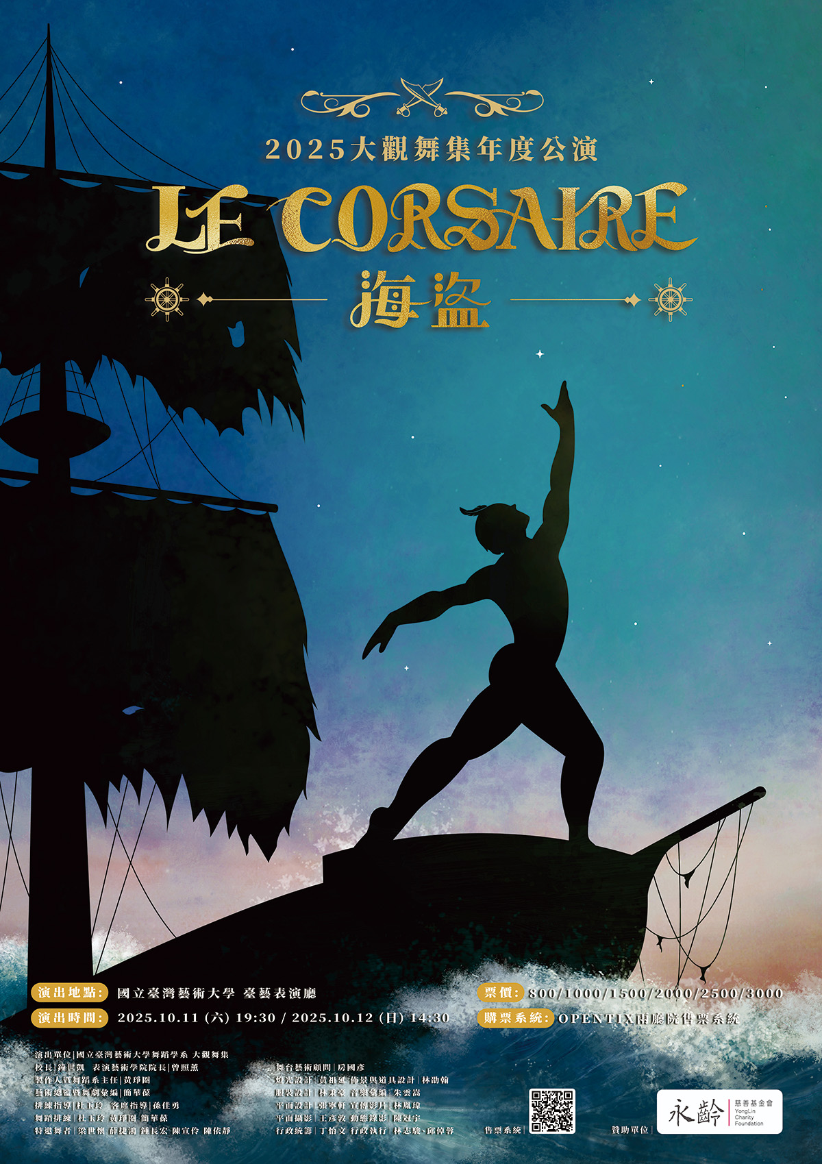 2025大觀舞集年度公演⟪海盜LE CORSAIRE ⟫,由本校優良芭蕾師資:杜玉玲、黃琤圈、簡華葆共同重建與編排,特別邀請臺灣優秀知名旅外舞者:前韓國環球芭蕾舞團獨舞者梁世懷與現居日本The Ballet Show舞團獨舞者薛捷鴻擔任舞劇主要角色、瑞士洛桑貝嘉芭蕾舞團主要演員孫佳勇擔任本年度製作的客席指導、臺灣優秀舞者鍾長宏與多位台藝大舞蹈系優秀校友參與演出,堅強的藝術家陣容將會是一場相當令人期待的跨國、跨校、跨領域的大型古典芭蕾舞劇製作。